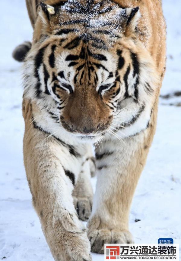 1月13日,在吉林省東北虎園內,一只東北虎在雪地上踱步。