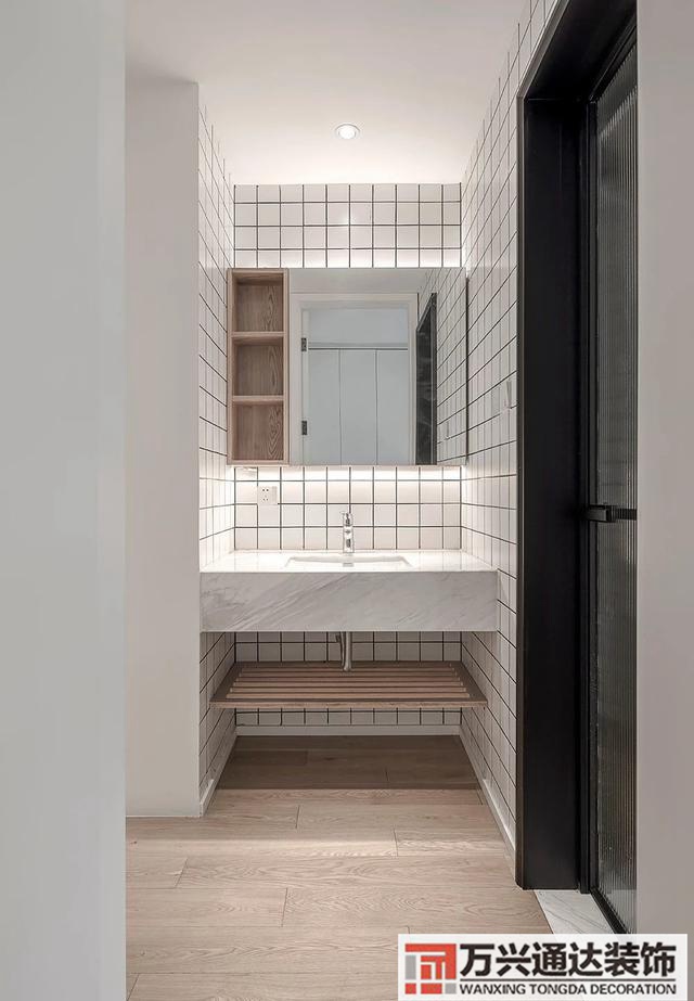 5.浴室柜懸空不管是現場手工定做還是定制,建議浴室柜都懸空30公分左右,下水改成墻排。下方留空處可收納各種盆和生活用品,也能減少衛生死角。
